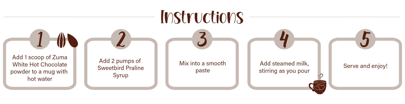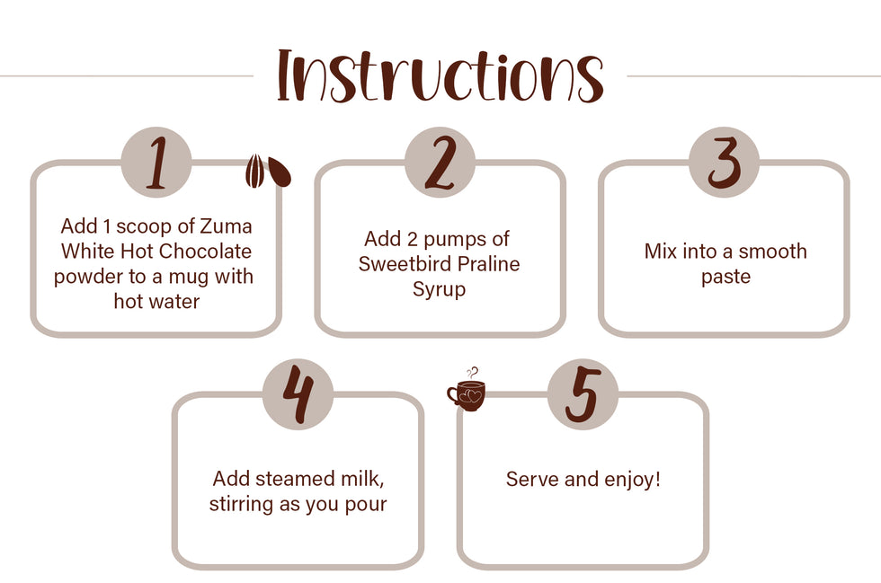 Treat yourself to the indulgence of March with our White Praline Hot Chocolate. Made with Sweetbird Praline Syrup and Zuma White Hot Chocolate Powder, this creamy, smooth drink delivers a perfect balance of rich white chocolate and delicate praline flavour. Topped with a generous swirl of whipped cream, itβs the ideal drink for those moments when you want to unwind and indulge. Whether youβre enjoying it alone or sharing with friends, let White Praline Hot Chocolate be your cosy companion this month. π«β¨