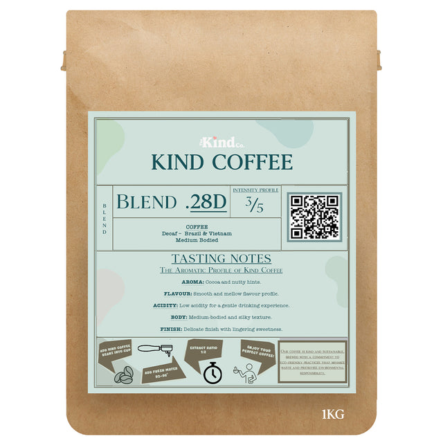 Discover the exquisite taste of Kind Coffee Blend .28D Decaf Whole Bean. Made from the finest quality beans, this decaffeinated blend delivers the full-bodied richness and aromatic depth of our premium coffees without the caffeine.